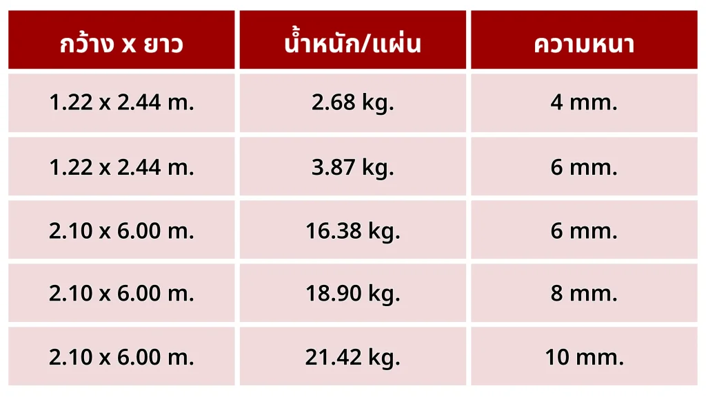น้ำหนักเฉลี่ยเพียง 1.3 กก./ตร.ม. (ความหนา 6 มม.) จึงสามารถใช้งานร่วมกับโครงสร้างหลากหลายประเภทได้โดยไม่เพิ่มภาระน้ำหนัก